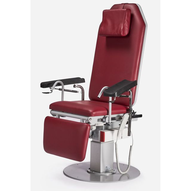 Electrically adjustable chair with Trendelenburg. Rotatable 360 degrees.With black PU armrests, neck cushion, patient handle, hand and foot controls.