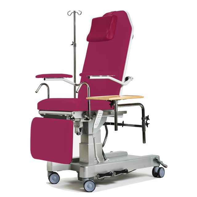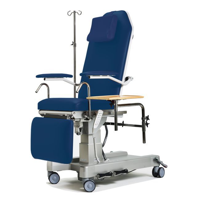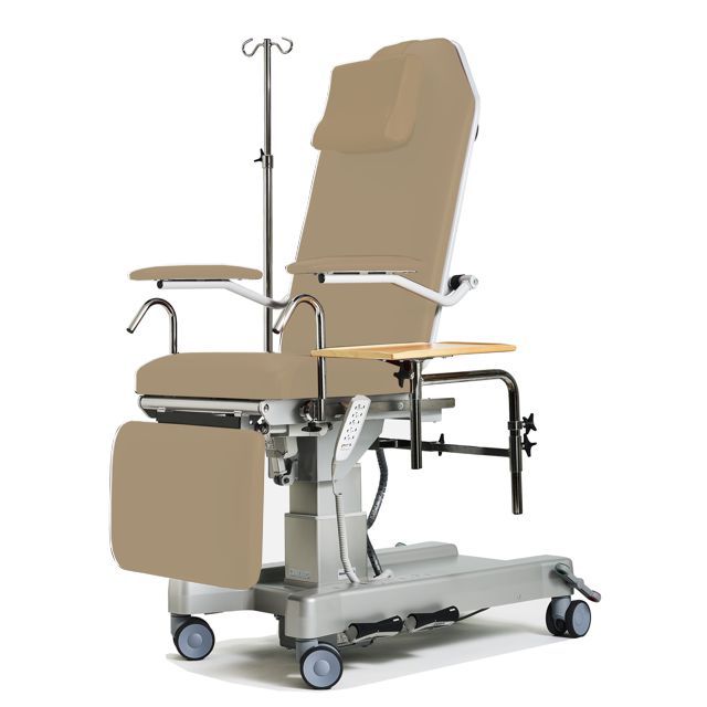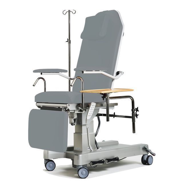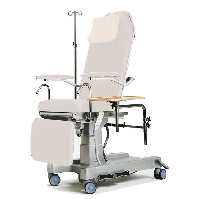 Elektrisk justerbar stol med Trendelenburg, for maks 215 kg. Egnet for bruk før en operasjon, for onkologi og annen lengre medisinsk behandling. Inkludert nakkepute, armlen, infusjonsstativ, avlastningsbord.Varenr: 010-5220-3