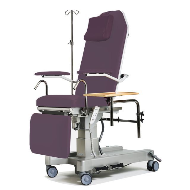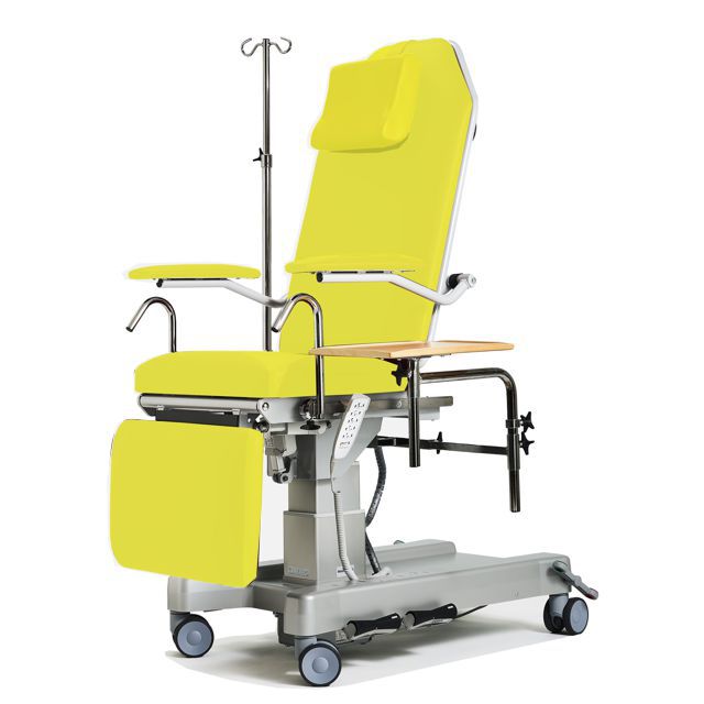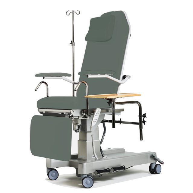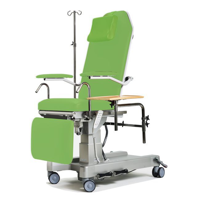 Modellen inkluderer nakkepute, armlener, infusjonsstativ og avlastningsbord som standard. Sentrallåste hjul er inkludert for å lette bevegelse mellom avdelinger eller under lokal behandling. På denne modellen er armlenene sammenleggbare. Alternative versjoner er også tilgjengelige med vinkeljusterbare prøvetakingsarmlener, enten med polstret pute eller svart PU.