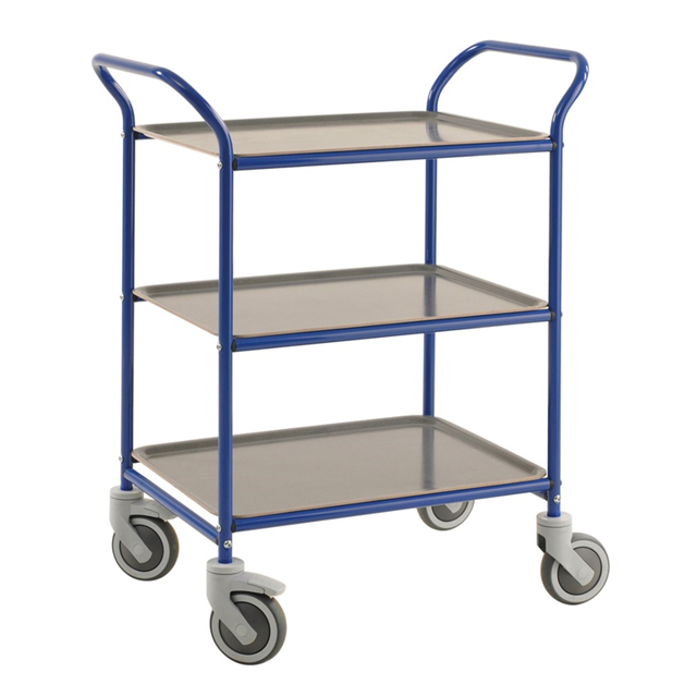 Pulverlakkert med 3 løse brett. 4 hjul, hvorav 2 med brems. Høyde til øverste hylle 820 mm. Avstand mellom hyllene 290 mm.
