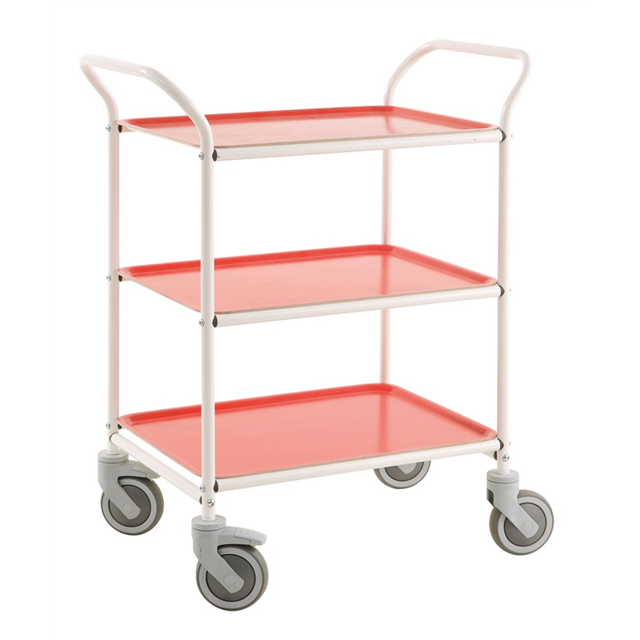 Pulverlakkert med 3 løse brett. 4 hjul, hvorav 2 med brems. Høyde til øverste hylle 820 mm. Avstand mellom hyllene 290 mm.
