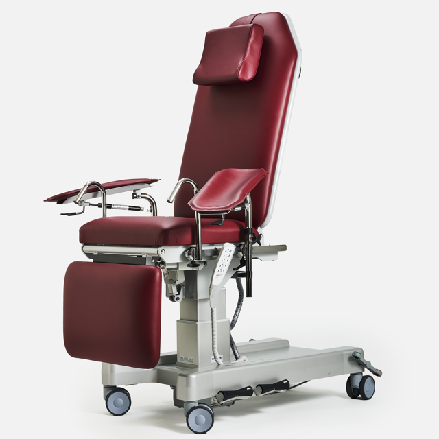 Elektriskt reglerbar stol med chockläge, för max 215 kg. Denna version har provtagnings-armstöd med löstagbar dyna. Lämplig inför operation, Onkologi och annan längre medicinsk behandling. Inkl nackkudde, armstöd, infusionsställ, avlastningsbord.