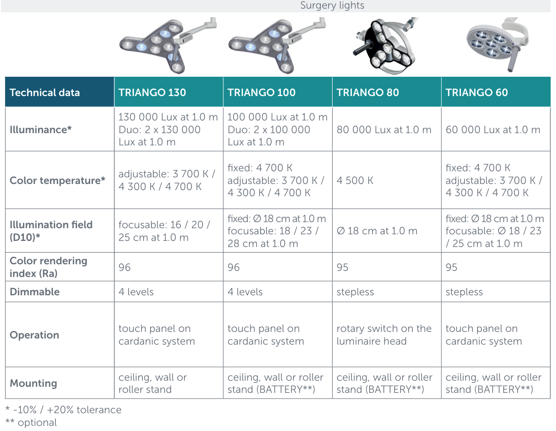 TRIANGO 100 säkerställer ultimata ljusförhållanden och är en perfekt assistent för varje läkare. Med en ljusstyrka på 100 000 lux vid 1,0 m stöder TRIANGO 100 precisa ingrepp och exakta diagnoser – allt till gagn för patienten. Se också särskild broschyr för veterinärer under "bilagor" nedan.