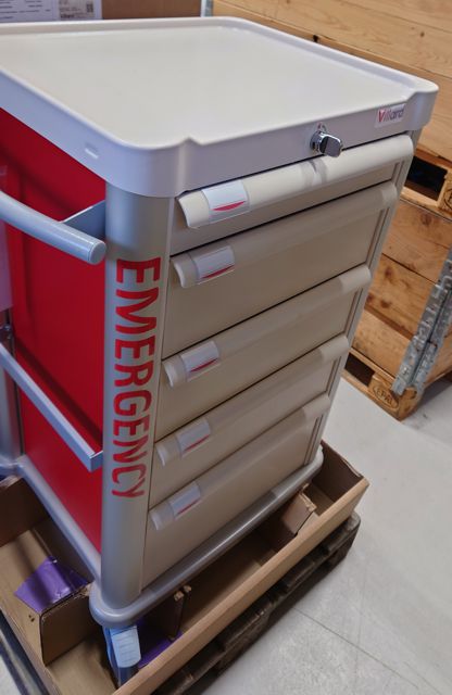 Robust och smidig vagn för akutvård. Med lådor i olika höjder. Kan tvättas i tvättunnel.